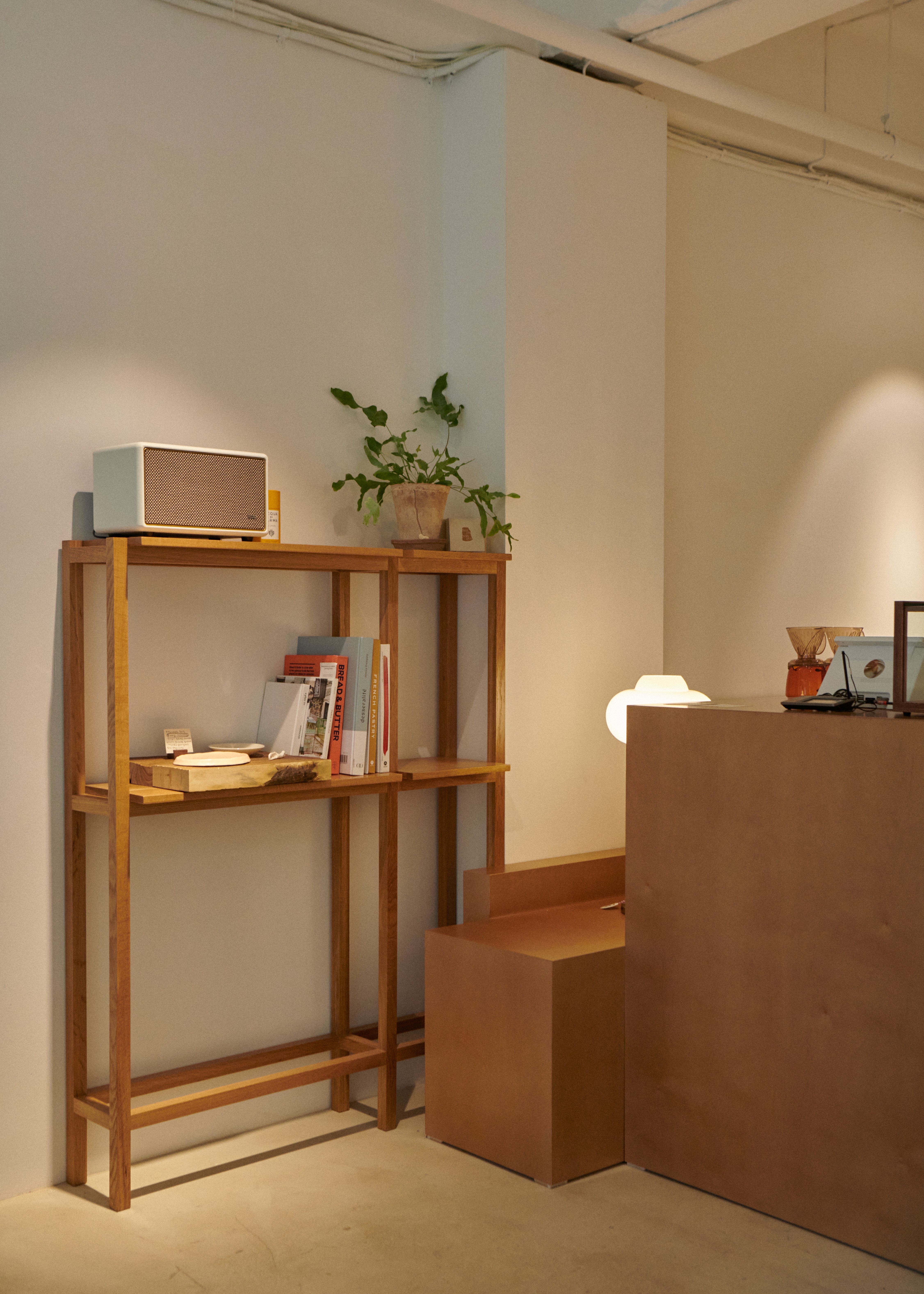 가구와 선반은 모두 마치 파티셰의 사적인 주방처럼, 집 안을 그대로 옮겨 놓은 듯한 이미지로 구성하였습니다. 특히 버터의 원뿔 형태에서 영감을 받아 디자인한 시그니처 가구는 공간에 상징성과 독창성을 더하며, 브랜드의 정체성을 공간에 부여합니다.