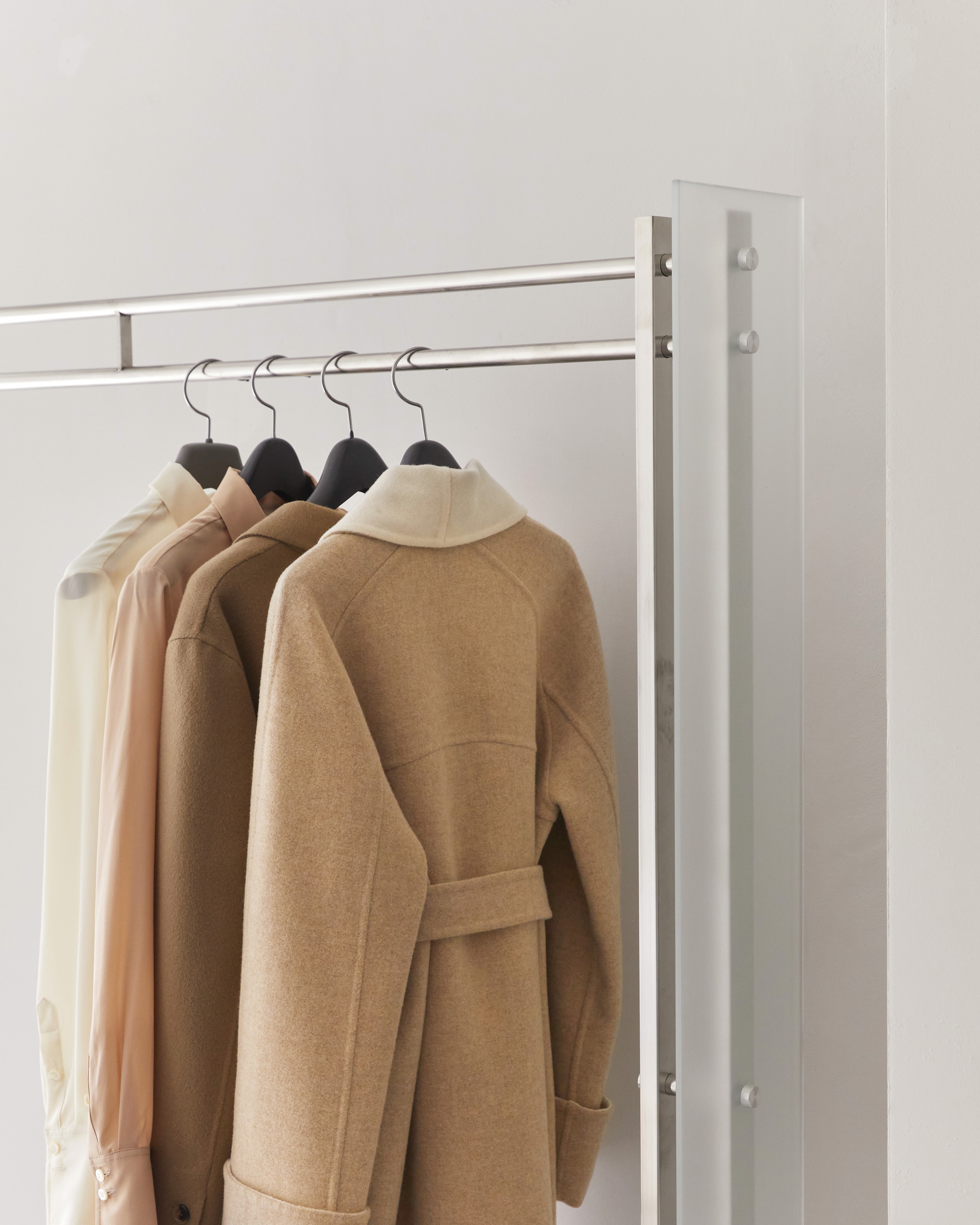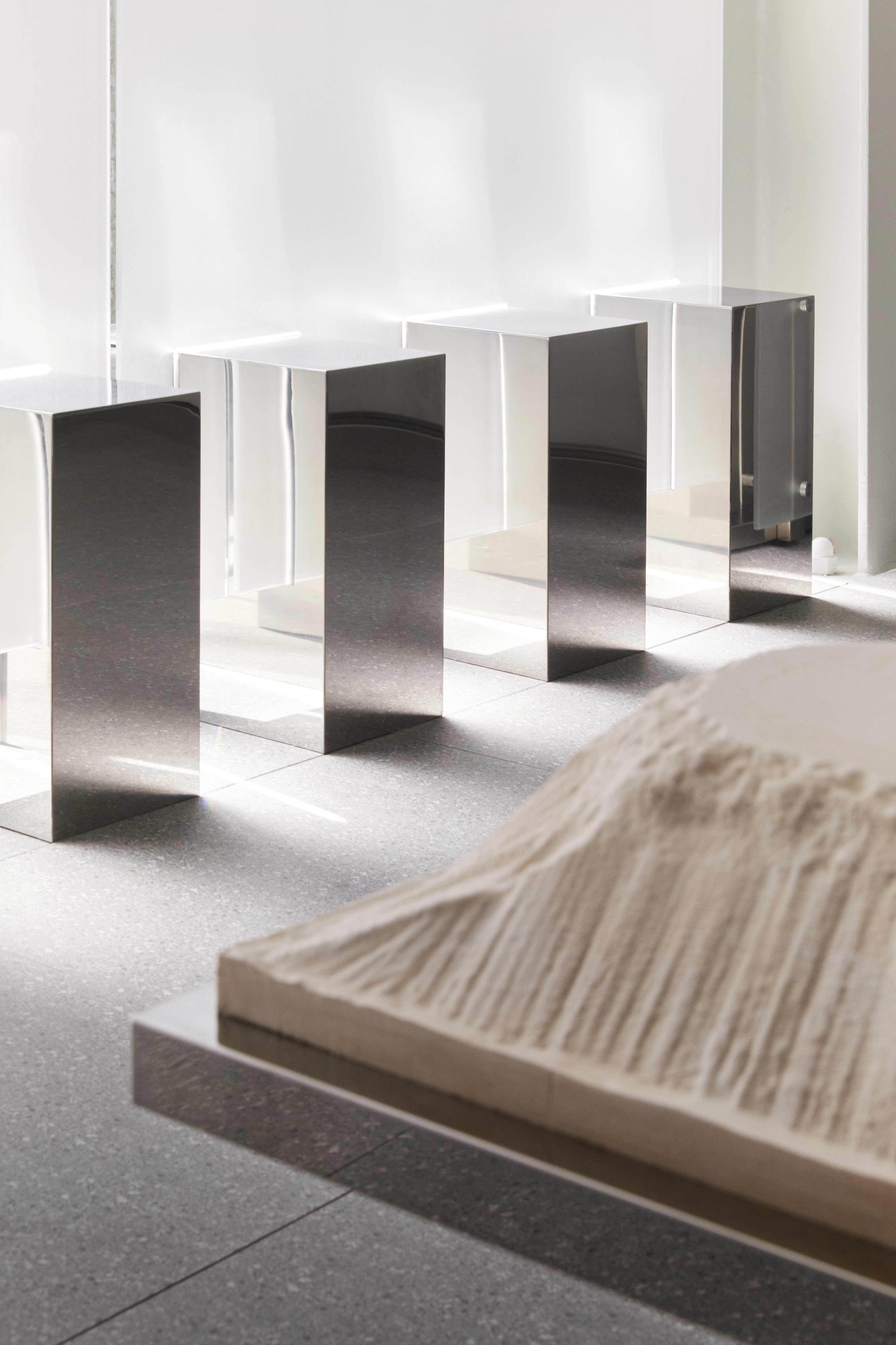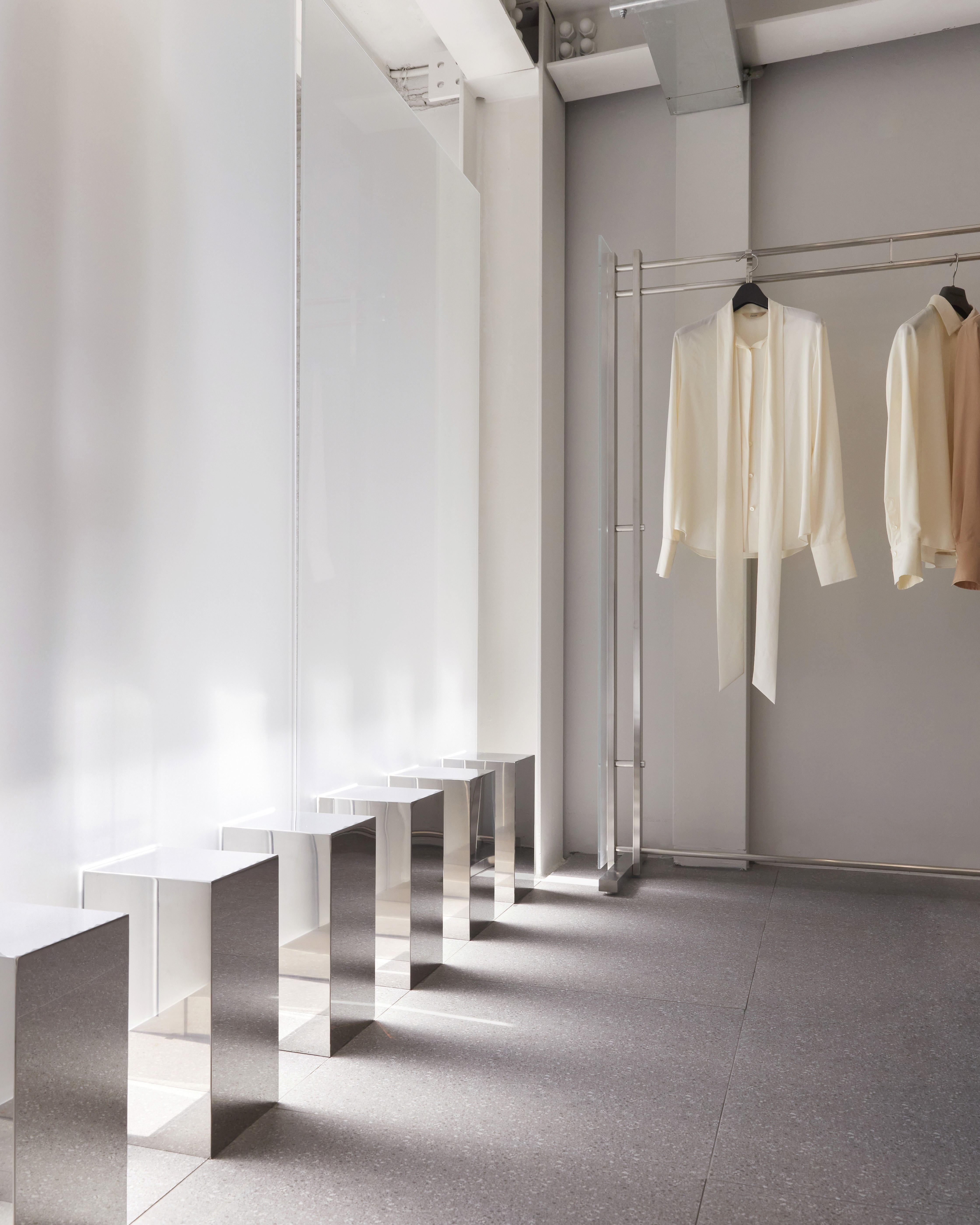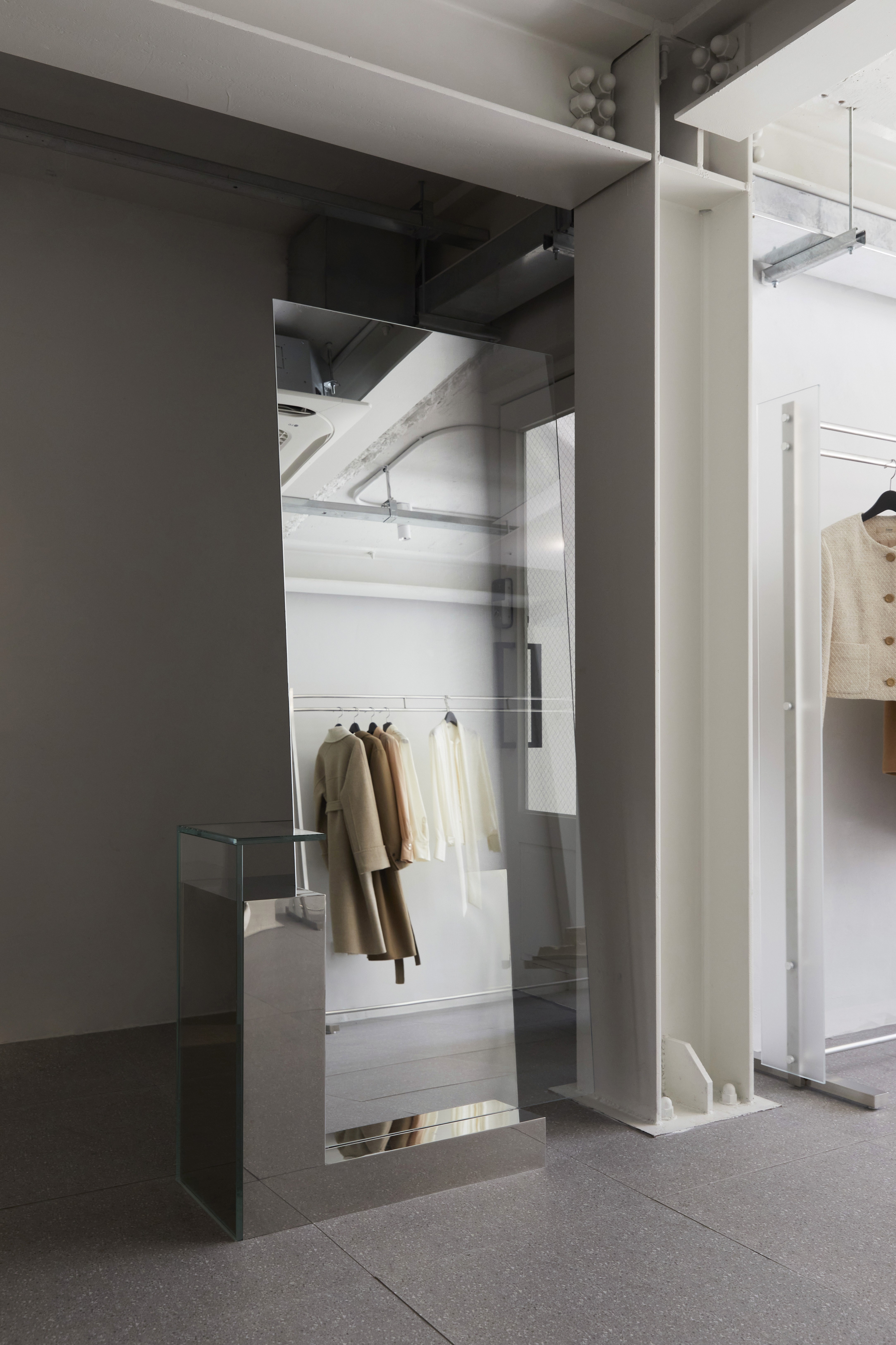 특히 창문의 파티션은 도널드 저드(Donald Judd)의 조형미에서 영감을 받아, 가장 기본적인 형태 안에 조형적 긴장감을 담아냈습니다. 외부에서는 내부 제품이 직접적으로 보이지 않지만, 내부에서는 마치 안개 너머에 떠 있는 듯한 이미지를 만들어내며, 감추고 드러냄의 경계를 통해 여성의 내면성과 자율성을 시각화합니다. 이는 FINNE가 추구하는 철학—자신을 위한 아름다움, 시대를 초월한 스타일, 그리고 내면의 힘—을 공간 언어로 표현하였습니다.