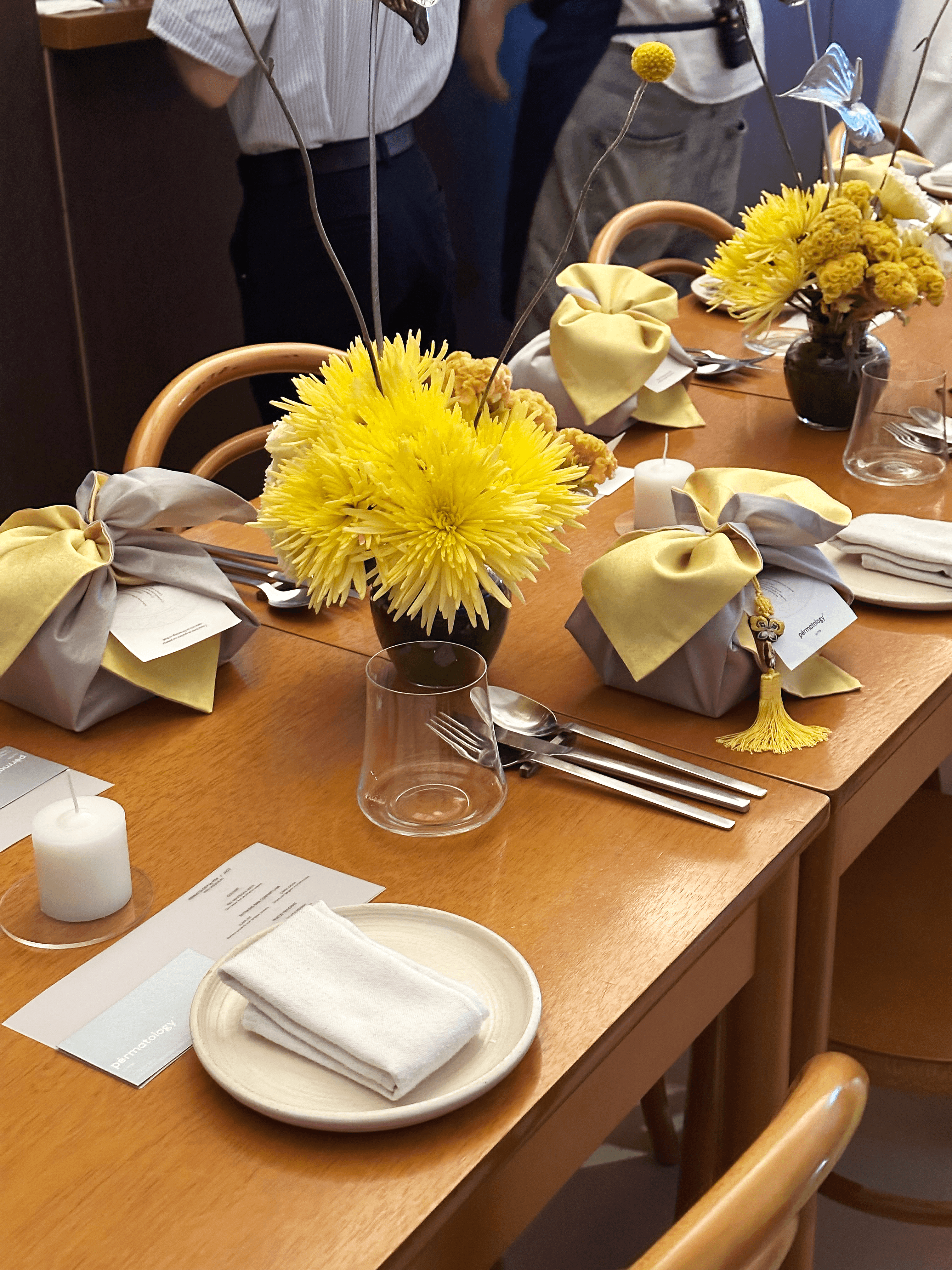 Silver as the key color, with yellow used across the event. VIP gifts wrapped in traditional Korean bojagi, adding a subtle cultural touch.